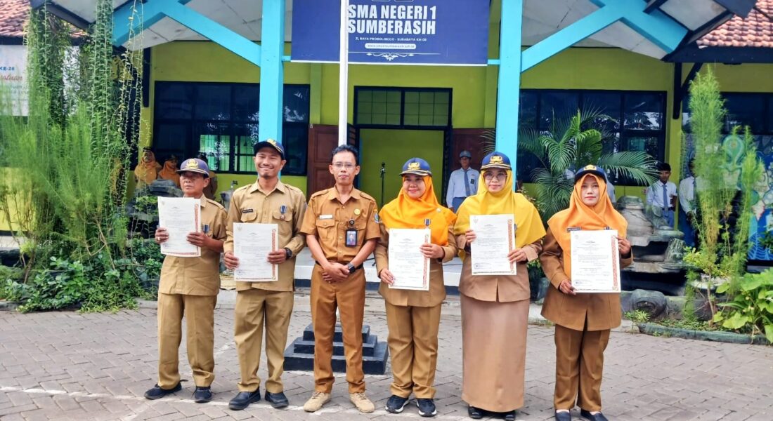 Pada momen tersebut, Bapak Muhlas Fauzi secara langsung menyerahkan piagam dan lencana penghargaan kepada enam guru penerima, yaitu Ibu Sucik Ambarwati, S.Pd., M.Pd., Ibu Sri Yunati, S.Pd., Ibu Novi Mudhofiroh, S.Pd., Ibu Lina Rachmawati, S.Si., Bapak Fathur Rakhman, S.Pd., serta Bapak Monalik dari bagian staf tata usaha. Penghargaan ini diberikan sebagai bentuk apresiasi atas loyalitas, konsistensi, dan kontribusi mereka dalam mendukung kemajuan sekolah. Dalam sambutannya, Kepala SMA Negeri 1 Sumberasih menyampaikan apresiasi dan rasa terima kasih yang mendalam kepada para penerima penghargaan. Beliau menegaskan bahwa dedikasi dan pengabdian yang telah diberikan selama ini menjadi fondasi penting bagi perkembangan sekolah, sekaligus menjadi teladan dan sumber inspirasi bagi seluruh warga SMA Negeri 1 Sumberasih.